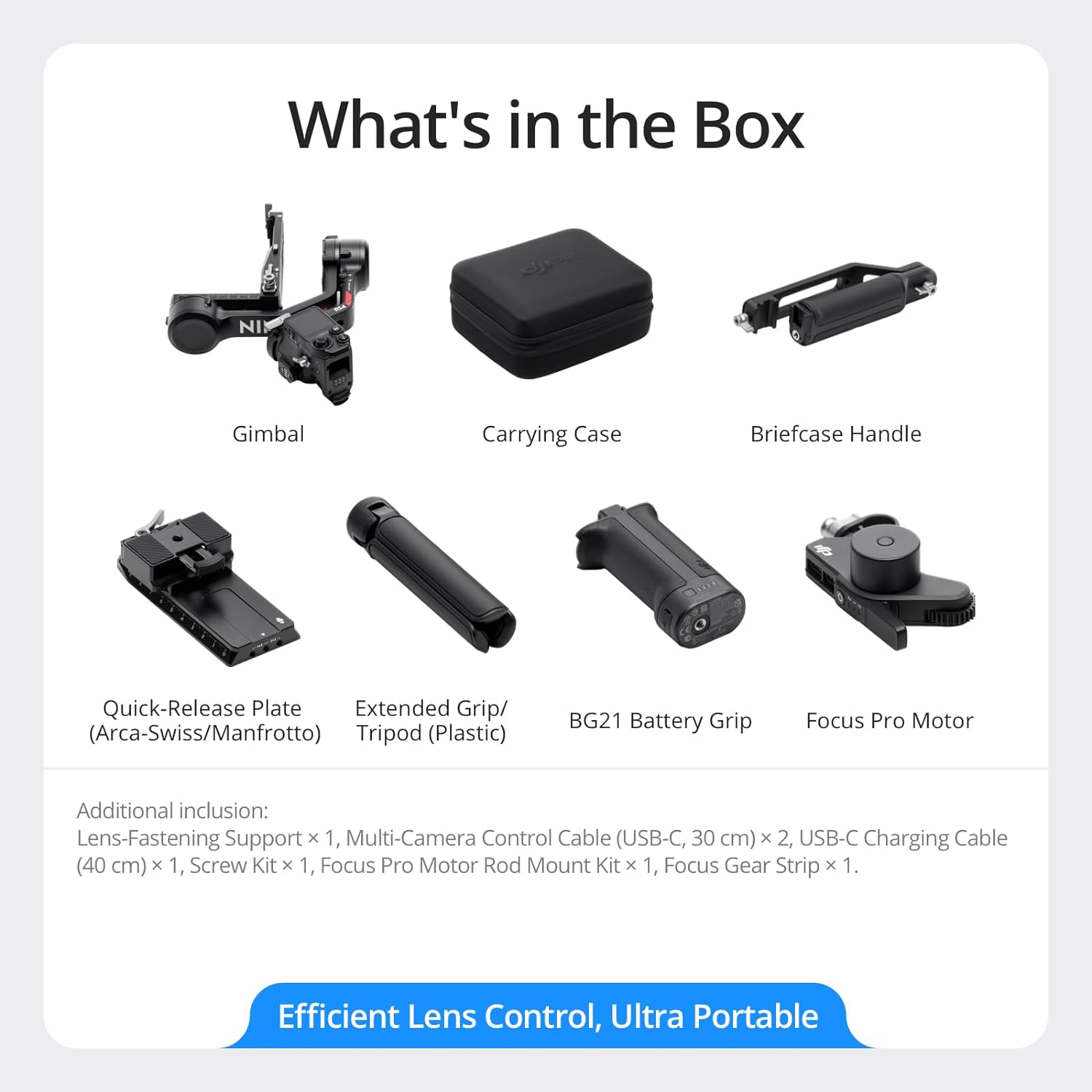 DJI RS 4 Combo includes a Gimbal, BG21 Battery Grip, Quick-Release Plate, Extended Grip/Tripod, Briefcase Handle, and more, as well as a Focus Pro Motor to add expanded function to manual lenses.